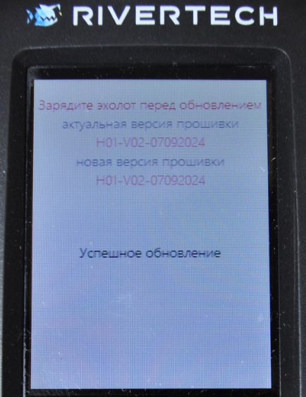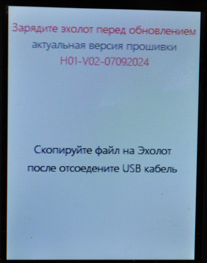 4. На экране эхолота будет указана актуальная прошивка, и надпись – «Скопируйте файл на Эхолот, после отсоедините USB кабель»